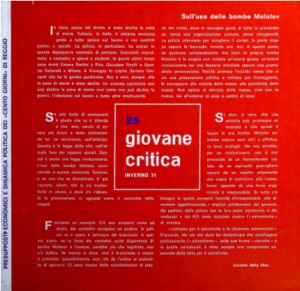 1. Questo numero di Giovane critica si presenta plU minuto del solito. e· stato amputato. a causa di irrecuperablll ritardi Upograflcl. di un ampio studio di Antonio Carlo sulla attuale natura soclo.economlca dell'Urss, studio che costi• tuisce a nostro avviso una assai ricca messa a fuoco dei ma• teriali, delle analisi, delle discussioni politiche che si sono succedute a tal riguardo nel mezzo secolo che separa i giorni nostri dalla presa del Palazzo d'Inverno. Tale studio costituirà il prossimo fascicolo. monografico dunque, di Giovane critica, di imminente uscita. Perno di questo numero. in ciò riprendendo uno del • temi • pi(i importanti dl quello scorso. è il resoconto di Pino Ferraris sui • cento giorni • di Reggio. Resoconto datato fine ot• tobre '70. e che perciò non tiene conto delle recentissime canagliate organizzate dal fascisti a Reggio (come del resto in tutta Italia). e che a noi sembra un ottimo prosieguo sopratutto nella parte che gli è piu propria ed originale - la • cronaca polltlca • del • cento giorni • - della discussione In corso nell'estrema sinistra e, al contempo, una adeguata rlspos1a alrarttcolo In cui Il compagno Alfredo Reichlhl aveva veemenle• mente (anche se con • astuta • vemenza) attaccato Vittorio Foa. Prosieguo di una discussione politica estremamente importante e forse s1orlcamen1e decisiva: discussione sul merito e sui con1enull, come Relchlin Invita a fare, e come Il Pcl raramente fa. proclive com'è, nel confronti dell'• estremismo•. alle vere e proprie falsificazioni e omissioni quando non alle mascalzonate glornalisllche. Discussione sul contenuti. costitutivamente disinteressati come slamo a un braccio di ferro altrimenti caro ad alcuni nostri cugini. braccio di ferro che noi cosideriamo micidiale al fini della crescita della sinistra rivoluzionaria, crescita che pochissimo si giova del proliferare di gruppetti e gruppettlnl omologhi quanto a settarismo e ad at• tegglamento. come dice Marco Boato. al gruppi ante-68. 2. La società contemporanea, non solo in ltalla, il quadro tutto della società civile, dalla Valle del Belice al • Politecnico • di Torino, sembra percorso da questo spettro, I'• estremismo •, da questa • utopia • che non trova attualmente un'adeguata traduzione In termini di discorso polltlco e di sua strumentazione organizzativa, e che addirittura non trova neppure gli slrumentl minimali del collegamento e dell'lnformazlone. uno specchio ampio ed esaltante delle lotte In corso. Per quanto cl concerne abbiamo perciò detto sf, e con entusiasmo, al quotidiano del Manifesto. Senza che ciò cl Induca ad abbandonare questo Imprecato frutto, contraddittorio e tormentato ma non banale. della • divisione del lavoro • esistente pur nell'ambito dell'estrema sinistra qualeltu/tto sommato è stato Giovane critica. 1.. 10~ -1