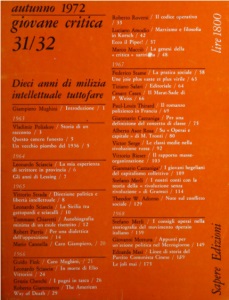 I testi q11i pubblicati sono traili dai numeri 1-18, oggi tu/li esauriti, di Giovane critica. La liratura media dei nn. 1-17 fu di 1000 copie. li n. 18 venne tirato in 2500 coP.ie. La vendita attuale di Giovane critica è sulle 3000 copie. 1 nn. 1-6 ebbero una diffusione esclusivamente locale e per abbonamento. Gli abbonati erano tutti interessati alla materia cinematografica.I nn. 7-1) vennero distribuiti a/Jraverso un'agenziache apparteneva a un futuro professore universitario. Lo implo111mmo. Lui, magnanimo, accel/Ò. Chiese un paio di versamenti anticipati, L. 140.000 in 111110. Dopo aver distribuito circa 5.000 copie, il professore ci inviò un assegno di L. 6.000 e rolli. In piU le librerie di tu/la /Ja/ia ci tempestavano di proteste perché non avevano la rivista. Minacciammo il professore. Ma non fummo gli unici, evidentemente, perché lui cambiò dri-:ticilio, di sera tardi. A cominciare dal n. 14 organizzammo alla buona e con t,rande sforzo un tessuto di distribuzione. Lo Libreria Feltrinelli di Roma vendé IO copie del n. 14; oggi vende 190 copie. Lo Libreria Hellas di Torino vendé 12 copie del n. 15-16; oggi vende 150 copie. Economicamente la rivista « tenne » perché il Centro Universitario Cinematografico,cui era originariamente collegata, versò un milione e forse qualcoseJta in piU. Inoltre dis-ponevamo di una discreta pubblicità locale; e di tre abbonamenti sostenitori, nello spazio di cinque anni. L'attrezzatura redazionale consisteva in uno schedario Buffe/li e in un telefono giallo. Le collaborazioni erano gratuite. E cosi pure il lavoro redazionale, in tutti i suoi aspe/li. A un collaboratore che viveva a Parigi e che stava per bai/ere il record europeo di digiuno inviammo qualche lira. A un altro, che ha firmato alcuni dei pezzi piU belli dell'antologia, consentimmo un rimborso in libri: da scegliere alla Feltrine/li di Milano. Ci scrisse, rosso dalla vergogna, che ne aveva pr1so u,ro un po' costoso. Nello scegliere i testi abbiamo alterato la fisionomia originaria della rivista. Per ragioni di spazio abbiamo dovuto omettere i saggi di Pio Balde/li sulla politica culturale, che pure caratterizzarono una stagione della rivista; i due saggi di Goffredo Fofi sul cinema e sul teatro del Fronte Popolare in Francia; lo studio di Mario Cannella sul neorealismo italiano. Abbiamo cercato di non pubblicare testi disponibili al, lettore moderno. Ad esempio quello di Franco Fortini sulla « fine dell'antifascismo ecc.» che ha avuto un'importanzaformativa determinante per noi. Un'eccezione a questo criterio è costituito dallo seri/lo di Edoarda Masi, oggi compreso nella TI edizione omp/iata di 11nsuo volumello einaudiano. Ma ci era necesrarioper allestare l'interesse della rivista per i falli della Repubblica Popolare Cinese. Interesse che, come è noto, ha caratierizzalo la generazione del '68. Non senza risvolti farseschi, purtroppo. Giampiero Mughini Dieci anni di milizia intellettuale tuttofare Dieci anni di « milizia intellettuale tuttofare» (l'espressione è di A. L. De Castris) non sono un'inezia. La qual cosa, di per sé, non autorizzerebbe il replay cli vecchie carte. Se non ci fosse di mezzo un elemento strettamente quantitativo: si tratta di materiale in grandissima parte inedito per l'attuale pubblico di Giovane critica, tre volte piu numeroso e completamente mutato. Chi sfogli le 200 pagine che seguono, stralciate da un lavoro editoriale che copre il periodo 1963-1968, non pensi trovarvi la rivendicazione di una qualche nostra primogenitura. Vi troverà solo, ma non è poco, uno specchio obliquo che rifrange le idee, le tensioni, le speranze di una generazione intellettuale. Una sorta di sintesi, culturalmente parlando, tra Lacerba e le riviste gobettiane; un pasticciaccio vitale, genuino, perché in quel modo lo vivemmo fin nel fondo delle nostre scelte personali. In politica eravamo operaisti; chi perché abitava a un tiro di schioppo dalla Fiat, chi perché aveva letto Mario Tronti. La concezione generale della Società, della Storia, i Fini ultimi ci straripavano da tutti i pori. Era un effetto di reazione, certo. Nel frattempo siamo andati mutando tutti, in questi dieci anni intendo. Se dovessi incontrare oggi alcuni di quei miei soci di generazione, accadrebbe come in un western: a chi estrae per primo la colt. Eravamo figli del '56. Muovemmo i primi passi in un rifiuto furibondo dell'esperienza staliniana. Ci parve dover tornare a Marx, alle fonti, come sempre accade quando una cultura ne aggredisce un'altra. E noi aggre-