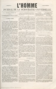 ·, Un espion a été poignardé, d'~11coup porté comme c~lui qui a frappé M. Rossi en 1848, et qui a depu1$frappé plus d un agent du Pape. . A Perugia, il y a eu des troubles à cause de la diset_te. A R~- venlile, les troupes pontificales :iyan~ relevé la garnison_ autri: chienne, ont été reçues avec enthousiasme par la population. qui saluait en elles des troupes nationales. De nombreuses arrestat10ns ont été faites à Faenza. Le gouvernement français déclare. a~jour~•hui que la missio_n confiée à M. Brenier concerne l'admm1strat10n des postes; mais on y croit peu, en Italie ; et on s'attend s~bien à_voir écl_at~rla guerre dans Je:.Apennins, que la compagme anglaise so11m1s~~onnaire du chemin de fer toscan, a refusé de verser la deux1eme moitié de son cautionnement, "à raison des graves événements "qui menacent l'Europe et :fftout l'Itali~ centrale." . C'est donc une guerre gé"' •rale qui va commencer : pourquoi n'est-ce pas une guerre r' olutionnaire ! Nous n'aurions pas à en redouter le dénouement. Tout à vous, Ph. FAURE. Un captif irland,,; •. M. Mitchel, échappé aux fers del' Angleterre, ·. repris à New-York sa tâche interrompue pour la !.·>érationde son pays. Le Citizen a paru, et dès le second numéro, les amis de l'Humanité, les promoteurs de l'indépendance des peuples, ont éprouvé un cruel désappointement: l'avocat d'un peuple si longtemps tenu à l'étatd'ilotisme, prêche le maintien de l'esclavage. La scandaleuse déclaration des principes professés par M. Mitchel sur cette plaie sociale des Etat-Unis, a provoqué l'excellente lettre qu'on va lire. Nous lui avons donné place, bien que nous n'approuvions pas la voie où se sont engagés les abolitionnistes de ce pays. Pourquoi discuter, quand le parti de l'esclavage refuse la discussion et charge ses armes? Pourquoi invoquer ces alitorités philosophiques, religieuses, etc., avoir recours à un immense appareil de dialectique, afin de démontrer une vérité aussi simple, aussi élémentaire que le droit à la liberté de tous les hommes? C'est assez de paroles, assez d'érudition; il n'est pas besoin d'étudier cette question pour la connaître. Préparez-vous, pour les moments opportuns, à l'ac_- tion légii.lative efficace : des résolutions énergiques avanceront plus les intérêts de l'Humanité que tous les trésors des bibliothèques. Voici la lettre adressée à M. Mitchel : MONSIEUR, L'Europe démocratiq-veaimait à vous mettre au premier rang des champions de sa liberté._ Défenseur des droit,s méconnus de l'Irlande, tous les peuples, toutes les races opprimées voyaient en vous leur logique défenseur. Apr-ès votre discours à San-Francisco, après la déclaration formelle que le républicanisme est la tendance générale du. vieux continent, la république universelle a cru pouvoir compter sur vous. Martyr si longtemps vous-même d'une cause inséparable et solidaire de la cause de l'Hamanité entière, comment n'aurait-on pas espéré que votre sympathie était à jamais acquise aux martyrs de toutes les tyrannies? Cette espérance, je dirai presque cette certitude, vient d'être étrangement anéantie par votre second numéro du Citizen. R~pondant à un de vos compatriotes, M. Haugthon, qui vous exhortait à vous montrer conséquent dans vos principes, et à prendre fait et cause pour les malheureux esclaves des Etats-Unis, vous dites : " Nous ne sommes pas abolitionnistes-pas plus abolitionnistes que Moïse, Socrate ou Jésus-Christ.- Nous nions que ce soit un crime, un tort, ou même une peccadile d'acheter des esclaves, de vendre des esclaves, d'astreindre les esclaves au travail par le fouet ou toute autre corttrainte nécessaire. " Par votre silence, dit M. Haugthon, vous participez aux injustices qui leur sont infligées." Nous ne serons pas silencieux quand l'occasion de parler se présentera; et, quant à participer aux inj11stices commises à leur égard, nous, pour notre part, nous désirerions avoir une bonne plantation, bien fournie de nègres vigoureux, dans l'Alabama." Quel langage, monsieur, et quel vœu ! Un captif, qui vient de rompre des fers comparativement légers, et qui déclare qu'il n'est pas abolitionniste, c'est-à-dire, en d'autres termes, qu'il veut maintenir les fers si lourds portés par les esclaves! Un homme qui met la reine Victoria et ses ministres au ban de l'Humanité pour le traitement dévolu à, lui et aux siens, et qui proclame légitimes les tortures cent fois plus dégradantes, plus poignantes, plus douloureuses de plusieurs millions de ses semblables ! Vendre ces malheureux, les acheter, les astreindre au travail par le fouet ou autre châtiment ; tout cela obtient votre approbation, ardent réprobateur de l'oppression des Irlaudais ! Vos compatriotes pourtant ne sont ni achetés, ni vendus comme autant de têtes de bétail, et jamais on n'a songé à les guérir de la paresse au moyen de la fustiga•on. Non! le cuir sanglant du commandeur ne déchire pas les épaules de vos toncitoyens, ils ne sont pas offerts aux marchés publics, à tant la pièce, hommes, femmes, enfants, ensemble ou séparément. L'ile d'Emeraude doit s'estimer heureuse de n'être pas soumise à un gouvernement assez osé pour réaliser l'assiDlilationque vous faites, dans le même article, entre les L'HO~ill E. Irlandais et les esclaves d'Alabama, ces esclaves dont vous convoitez uij.ebonne part. Alors, monsieur, plus d'agitation pénible, plus d'espérance d'obtenir le redressement de griefs religieux ou politiques, plus d'émigration même! Ceux qui voudraient aller chercher la liberté en Amérique seraient affichés, pourchassés, renfermés dans des cachots, et, sur la décision arbitraire du moindre juge, livrés à leurs propriétaires. Ils seraient, suivant vous, dans ce cas, mieux logés et mieux nourris qu'ils ne le sont actuellement. J'admets ce prétendu avantage, qu'on peut contester, et je demande à vos frères d'Irlande déguenill