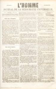 -SCIENCE.- -SOLIDARITÉJO-URNADLELADEMOCRATIUENIVERSELLE. N6 26. MERCREDI, 24 Mj\.I 185-L 1 (Jersey), ]!), Dorset Street. -Les manuscrits déposés ne seront pas rendu~. - O:-.r s' ABOKNE : A Jersey, 1 !), Dorsr, s~rret. - A Londres, 50¼, Grcrrt Qucen strtet, Linco!n',,- Inn-Fidds. - A Ge-xève (Suisse), chez :;o,l.Corsat, libraire, rnt? Guil!ai.:me-Tell. - Ar-or,ETtRRE i>.T Cor,oNrzs : PouR L',i:-rRA:'<'GER : C:e Jou.&'llUll 1,an•aii une :foâ§I 1•a1• se11na.h:ie. Taules lettres et" correspondances rloivent être afü-anchies et adressées au bureau tlc !' Irn!)rimerie Universelle à St-Hélier Belgique, ch::>zM. Leconte, rue de la Rivit,~c, 16, faubourg de Cologne à Bruxelles. - ,1 1lladrùl, chez C. .:ilonnier, lih:·aire. Un an, 8 shillings ou 10 franc,. Six mois, 4 sh. ou 5 fr. Trois mois, 2 sh. ou 2 fr. 30 c. CIL\QUE '!U)U;RO: 3 pence ou 6 sous. Un an, 12 fr. ô0. Six moi~, 6 fr. 23. Trois mois, 8 fr. 50 c. 'trous !e~ a!~oR.11ne11nentt Ille IHi:.a~at d'a,·a1.1n ee. ---------------------------------------------------------------------'t ' A~rfi§ aux .,.-\1 l~onu.es, Nous pré,·enons les per.sonnès qui se sont abonnées au journal l'Homme, soit pour un an, pour six mois ou pour trois mois, et qui n'ont pas encore versé le montant de lenr abonnement, qu'elles sont instamment priées de s'ac'quitter sans retard entre les mains de ·M. Leconte, rue• de la Rivière, 1G, faubourg de Cologne, à Bruxelles ; de M. Corsat, libraire à Genève, rue Guillaume Tell, chargé de recevoir pour la Suisse et le Piémont. Quant aux abonnés d'Angleterre et des Colonies, ils peuvent s'acquitte1· de ce qu'ils doivent en en-voyant directPment à l'atlministration du journal, à St.-Hélier (île de ,Jersey), 19, Dorset Street, un mandat sur la poste portant le nom de M. Zéno SwrnTOSLA WSKI Pour les autres pays, il suffira d'adresser un mandat au nom ci-dessus désigné sur un des banquiers de Londres. On prie également les personnes qui renouvelleront leur abonnement, d'en envoyer le prix d'avance à l'adresse indiquée, afin d'éviter tout retard dans l'envoi du journal pour le nouveau terme <ln second sérnestre et du troisième trimestre, terme qui commencera le 1er juin prochain. I. Il y a dix ans à peine, les bourge:>is de France étaient les maîtres dans les affaires, dans la politique, dans le gouvernement. Ils avaient deux assemblées, l'une pour les illustrations, l'autre pour les ambitions : ils avaient le crédit par les banques,. les industries par le capital, l'administration par les votes, le commerce par la commandite, et la terre que leur avait livrée la révolution de 89 les reconrnüssait pour rois. Si la bourgeoisie, dans ces magnifiques situations, avait compris son rôle et su se limiter, se gouverner elle-même, croit-on qu'elle aurait tout perdu dans une journée, et, qu'elle. serait aujourd'hui déchue, vassale, méprisée, sans influence ni dans la cité, ni dans les affaires générales ? Croiton que ses tribunes auraient été renversées comme des échoppes, que ses hommes, quelques uns du moins, auraient été proscrits, comme des malfaiteurs, qu'une conspiration heureuse aurait pu livrer à la censure tous ses organes indépendants, à l'arbitraire toutes ses libertés,-ù. la police ses foyers,· ses biens et ses personnes '{ • Du rég·ime de février, franc, ouvert, rayonna!lt et pur comme un ciel d'été, de cette révolution qui ne versa d'autre sang· que celui de la bataille, au conp <l'état de dé~embre qui n'a laissé que des ruines, de,, cadavres et des hontes, quelle différence! C'est un abîme de plusieurs siècles qui s•épare ces deux journées : d'un côté la vie, la liherté, l'epanouissement, l'espérance m1xmains pleines de palmes et de miséricordes; de l'autre côté l'assassinat, les bonrreaux, le sang des enfants, les li0ertés aux: fourches, la proscription marquant cent mille têtes et cent miile portes -un empire enfin ,qui a besoin de la nuit, comme le crime, et qui pourmieux abriter ses débauches éteint tous les flambeaux allumés depuis deux siècles par l'intelligence humaine. Entre les deux sitilations, entre le rayon de février et l'ombre de décembre le conu-aste est si marq_né,si lugubre que les bourgeois de France en ont parfois horreur et qu'ils regrettent amèrement, dit-on, et leur royauté politique et leurs petits <léhats padementaires du temps de Louis Philippe. Nous le coïnprepons facilement, f't non-, avouerons, sans peine, qu'entre les denx autorités, celle qui avait le contrôle des mœurs, le rontrôle cles lois, le contrôle des asf.emblées-ct celle qai u'a d'autre règle que son caprice, d'autre Ei~rie que son ambition, d'autre conseil que les .servilités besogneuses qui l'eutoureut, la civilisation ne S(:)raitpas l\)ng-temps à choisir : 011 aimt: mieux, en tout état de cause, avoir affaire aux avoués qu'ù Cartouche, et les timbres de l'huissi0r sont moins saung-es que le couteau de Lacenaire. l'ifais ce régime des huissiers, des avoués, des greffiers et parlementaires constitutionnels, qui l'a donc coi;npromis, usé, perdu·~-La bourgeoisie. II. Oui la bourgeoisie ! - que faisaient ses assemblées de leur iuitiati ve et <leleur liberté quasi-sou- • Yeraine? L'une, celle des pairs, vivait dans' - les pourpres de son passé., somnolente et ne s'éveil-. lant que pour tenir ses justices ; elle n'était point la contemporaine du siècle, elle était nommée par le roi. Que faisait. l'autre, celle des deux cent mille privilégiés·~ elle gardait son mandat d'abord et puis les privilèges de ses commettants, - privilèges du fer, <lela houille, du coton, des compagnies, des officiers mi11istériels, privilèges judiciaires et privilèges politiques. ~n bas vivaient les nrnsses, reléguées, p:1rquées daus le néant et l'ombre, eutre le travail incessant et le salaire problématique. Dans ces n'-igions aucune lumière, aucune franchise; on n'était P"" citoyen, on n'était pas homme; c