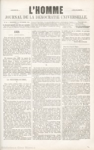-SCIENCE.- ' -SOLIDARrrÉ.- JOURNALDELADEJ\!IOCRA1 1IE UNIVERSELLE. Ne 49. - MERCREDI, 1er NOVEMBRE J 854. Ce J ou1•11al 11a1.•ait une Cois ,~a•• se111ai11e. Toutes lettres et correspondances <loivent être affranchies et dressées au bureau de l' Imprimerie Universelle à St-Hélier AVIS A U X A B o· N N É S . Nous prévenons les personnes qui voudraient souscrire ou renouveler leur abonnem1·nt au journal l'Homme, soit pour trois mois, soit pour six mois, soit pour la deuxième année tout entière, qn'elles sont instamment priées de s'acquitter· sans reford entre les mains de MM. les Agents chez lesquels le renouvellement ou l'abonnement nouveau se contracte, ou bien de l'envoyer directement à l'administration du journal, à SaintHélier (île de Jersey), 19, Dorset Street. - Da11sce dernier cas, il suffira d'adresser soit un mandat sur la poste, ou un billet de change snr un des banquiers de Londres, au nom cle M. Zeno SwIETOSLA WSKI. On trouvera chez MM. les agents du journal ou à l'Imprimerie universelle, 19, Dorset Street, à Jersey, les numéros qui rnanqueraie11t ai.;ix personnes f Lisant collec-. tian de l'HOMME, à raison de 3 penre (G sous) l'exemplaire pris séparément. Quant aux personnes, au contraire, qui 'désireraient avoir tous les numéros qui ont .paru jusqu'à ce jour, elles peuvent se les procurer aux mêmes conditions d'abonnements qui se trouvent indiquées, ponr -chaque pays, en tête de notre jonrnal. LA DERNIEREGUERRE. r. Nous voulonc; substituer l'icU:e à la force, la prenve à la violence, la logique au sabre,· et c'est pourquoi nous n'avons que des anathèmes pour tous les gouvernements personnels, qu'ils s'appellent Empires, Dietatures ou Monarchies. Le despotisme pille et tue, dévaste et brise, comme un vent aveugle. Il peuple les villes de morts, les citadelles de captifs, les chemins de proscrits ; il coupe les têtes sur les échafauds, il rase les monuments qui l'acc,,sent. il fait la guerre aux pierres, comme aux hommes : il est la cor<le et le sabre, la ~·uillotine et la roue ; c'est CaïnCésar. Mais les dévastations, les supplices, les assassinats, les tourments et les agonies ne sont point sc·s crime~ les plus abominables; ce n'est point le monument, ce n'est pas la pierre, ce n'est pas le cadavre qui crie le plus haut coutre lui, vers le ciel; c'est la conscience humaine violée comme un temple ouvert, humiliée, suppliciée dans sa foi, dans sa liberté, dans so11honneur. Que des milliers de captifs se tordent et pleurent sur la dalle nue des eachots-tombes; que des caravanes d'exilés courent la terre sous la guenille,. sans travail et sans pain ; que des groupes de martyrs tombent décapités sur les grandes places et soient traînés au charnier, cela, certes, doit épouvanter la terre et faire l'histoire implacable; mais toutes ces ruines humaines, membres rompus, têtes au panier, captifs aux fers, proscrits ~rrants, toutes ces ruines du sancrdisparaissent sous la génération qui monte, fleu~ du lendemain, moisson nouvelle, et la vie couvre la mort ! Ce qui ne revient pas tant que la force dure, c'est la tribune tombée, c'est la liberté morte, c'est l'idée muselée, c'est le livre impossible, c'est l'esprit, c'est la conscience humaine, c'est l'âme publique condamnée à la mort du silence et de la nuit qui est la grande misère ! Et, ce n'est pas la tradition, seulement, ce n'est pas la vie successive. qui est interrompue, g-ênée, (Jersey), 19, Dorset Street.-Les manuscrits déposés ne seront I Ar-or.ETER_R~ ET Cor.o:-in:i;: pas rendus. - ON s'ABONNE: A Jersey, 19, Dor~et street. - AI U_n an,_8 shillings ou 10 francs. Londres, chez M. Zmichowski, 28, Greek-street, Soho Square.-A Six moi~, 4 sh. ou -5 fr. Genève (Suisse), chez .M. C?rsa_t, libraire, ru~ CJ:uillaume-Tel), ~ , Trois mois, 2 sh. ou ~ fr. 50 c. PuUit L'ÉTRANOE!t : Un an, 12 fr. 50. Six moi8, 6 fr. 25. Trois mois, 3 fr. 50 c. Belgique, chez tous les libraires. - .A 1lladnd, chez Casn111r CHAQUE NUMERO: '.i'@u11!Jes abonn1e1i1ens lie 1ui&ent d'a,,a1u:e. Monnier, libraire. 3 pence ou ü sous. mutilée, c'est le caractère, le grand caractère humain qui s'amoindrit, s'efface et se perd dans la servitude. Les âmes s'affaissent, les intérêts se prosternent, la lèvre se fait conrtisane., et les plus braves viven· à l'écart, muets, impassibles, marbres-statues. Ah! voilà les deux grands crimes de la tyrannie -le cœur lâche et la vérité morte. Nous pourrions, faisant l'aumône au crime, taire nos tomhes, nos misères, nos larmes, nos douleurs, uos vengeances: serviteurs de passnge nous savons qu'on peut nous accabler et que la mêlée des révolutions dévore comme la bataille; mais le droit cles idées qui est toute la civilisation, et, le droit des consci1:;nces qui est tout l'honneur hnmaiu, nous ne pouvons les oublier sous peine de hau:e tnihison contre la vie génén1le, successive et permaneute, contre la grande majE:sté qui va de i'atô:ne à la science dernière, à Dieu ! Voilà pourquoi nous maudissons la force qui tue les âmes comme les corps, la force qui est mère de la corrnption et qui fait la nuit. "Rendez la lumière, disait Ajax, et que tout !'Olympe s'écroule wr moi !" C'est aussi la parol.e de la llévolution. II. Les hommes du droit qui comhattf'nt la force ne ·sauraient aimer la guerre, jeu stupide et sauvage, où le hasard distribue les victoires, où la terre qui n'appelle que le soleil ne boit que du sang, où la mort écrit les tablettes de la justice, et duquel on ne sort que pour tomber dans les tristes servitudes de lu gloire. La guerre est une des formes les plus bestiales, les plus monstrueuses de la fort;e, Pt dans peu l'humanité entrant dans la pleine lumière ne verra dans nos grandes batailles que <l€s folies bêtes et sanglantes. Nous tous qui avons en~eVLt la belle aurore des civilisations libres uous détestons la guerre, comme une violence, comme u11e corruption, comme un sacrilége contre la vie 