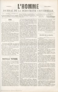 -SCIENCE.- ' -SOLIDARITÉ.- JO-URNAL·DLEADEMOCRATIUENIVERSELLE. Ne 51. - MERCREDI, 15 NOVEMBRE 1854. Cc .iouh•na,i a,a11.•ait une fois e~a.111•1enud111e. Toutes lettres et correspondances doivent être affranchies et dressées au bureau de l' f11;primerie Universelle à St-Hélier AVIS AUX ABONNÉS Nous prévenons les personnes qui se sout abonnées au journal l'Homnte, soit pour trois mois, soit pour six mois, soit pour un an, et qui n'ont pas encore \ ersé le montant de leur abonnement jusqu'au 1er Décembre 185-l, qu'elles so11t instamment priées de S'ACQUITTER SANS RETARD entre les mains de M. Eramus Z~HCHOWSKI, fZS. Greek-stn et, Soho Square, London, ou bieu de l'envoyer directement à l'administration du journal, ù Saint-Hélier (île de J crsey), 19, Dorset Street. Dai1s ce dernin cas, il suffira d'adresser soit un mandat sur la poste, ou en stamps, au nom de M. Zeno SwIRTOSLA WSKI. Les souscripteurs au journal !' Homme sont avertis que la SECONDE ANNEE du journal commencera le 1er D~cembre 1854; partant, l'Admi,1istratio11prie les personnes qni désireraient re11ouvelerleur abonnement, d'en envoyer immédiatement le prix d'avm1<'e à l'adresse indiquée, AFIN D'ÉVITEI{ 'l'OUT RErrARD dans l'envoi du journal r,our ·!e nouveau terme. - LE's conditions ci-dessus sont indisp011sahles et doiveut être remplies, - autrement les Abonnés s'exposeraient à la cessation de l'envoi <lu journal. On trouvera chez MM les agents du jo11rnül ou à l'lmprimerie univt>rselle, 19, Dorset Street, à Jersey, les •rnrnéros qui man ri ueraie11t aux personnes Jait>ant collection de l"I-IoM M,E, à raison de 3 penre (6 sous) l'exeni pl ai.l'e pris sépéirément. Quant· aux persom1es, au contraire, qui désireraient avoir tous les numéros qui ont paru jusqu'à ce jour, elles peuvent se les procurer aux mêmes condiLio11s d'abonnements qui se trouvent indiquées, po,tr chaque pays, en tête <le notre jo11rnal. LA NOUVELLE VICTOIRE. On a beau vouloir s\ibstraire de cette grande r:uerre qui se fait là bas, et se réfu~:ier dans l'averrir avec les espénrnces et les i<léi:,s,le terrible souci <lu jü11r vous suit partout et l'on revient forcément à Séhnstopol. Transportés, proscrits ou captifs, nous n'avons aucun intérêt direct engagé dans cette querelle des rois et des gouvenwments ; les Bourses de Paris, de Londres, de Vienne nous sont étrnng·ères, comme les cai~ses des empires; et, l'on nous a foit la misère si grn11de que nous µourrions, race errante, voir crou Ier le monde, sans que notre rui11ey fût mieux marquée. • Mais les intérêts ordinaires de la vie comptent peu dans l'esprit des sol<lats-conft>sseurs qu'anime la sainte idée de justice: le contin.c;ent ne les touche g·uères, qu'il soit le cachot, la misère ou l'exil, et ils s'en v.ont, sans trop plier sous le fardeau, tandis .que toute cause géuérale de patrie ou d'humanité les ·entraîne, comme uue destinée de famille. Voilà pourquoi cette guerre d'Orient nous émeut et nous tourmente; nous craignons que cette lutte sauvage, renouvelée des temps de la force aveugle, ne corrompe la civilisation et n'éteigne ses dernières lumières; nous craignons que le Rarjureg·net-apens baptisé par un peu de gloire 11e soit amnistié par les foules que la bataille enivre, et nous craignons anssi, nous craignons surtout-contradiction fatale qui est le trouble de nos cœurs !- nous craignons que la France, déjà deshonorée, ne fie démoralise dans des défaites qui sout à prévoir. 1 (Jersey), 19, Dorset Street.-Les manuscrits déposés ne seront I ANC:lJ.ETERRE ET Cor.o:-.otE~: pas rendus. - ON s'AnONNE: A Jersey, 19, Dorset street. AI Un an, 8 shilliugs ou 10 francs. Poun L'ÉTRANONR: Un an, 12 fr. 50. Six mois, 6 fr. 25. Londres, chez M. Zmichowski, 28, Greek-street, Soho Square.-A •Six mois, 4 sh. ou 5 fr. Genève (Suisse), chez M. Corsat, libraire, rue Guillaume-Tell. -1 Trois mois, 2 sh. ou 2 fr. 50 c. Trois mois, 3 fr. 50 c. Belgique, chez tous les libraires. - A Madrid, chez Casimir CHAQUE NUMt;Ro: '!l'ous ~e~ ahoHne■uen• ~e atal-i~nt d'a,·a.nee. Monnier, libraire. 3 pence ou 6 sous. Ah! nous sommes exposés à payer cher, bien cher, toutes ces épopées militaires du pr~mier empire qui nous laissèrent les frontières envahies, la haine des peuples, les musées pillés, les campagnes désertes, la patrie dans le deuil, et la plus formidable contribution de guerre qu'aient eu jamais à payer des vaincus ! Voilà que, déjà, le dernier de ces Bonaparte a jeté bas nos tribunes, nos philosophies, nos fouillessentinelles et tout éteint. jusqu'au sens moral, dans cette. France de la Révolution, nagnères ardente, illuminée comm.e un Sinaï. Cet héritier des grandes aventurPs a fait de notre pays une aubenre à soudards, une boutique à juifs, un cachot pour les penseurs, une cantine pour les polices: il a corrompu, faussé, dégradé les âmes timides, les faibles caractères; il a empoisonné l'ignorancf', dupé la misère, exploité la peur, proscrit la foi, le gén1e, les sair1ts dévouements - et, nrnintenant, par une gnnre mal conduite, livrée à des joueurs dP-coupd'état, faite à contre-sens, c'est-à-dire sans les penples, il est en train de compromettre, de ruio€r, peut-être, la France dans son dernier orgueil, celui des ~rmes. ' Certes, nous ne demandons pas pour notre patrie qne le temps revien11e de ces farouches victoires où l'on comptait par milliers les drapeaux conquis, et surtout les cadavres; nous avons trop souffert de ces légendes dites héroïques, et, dont le parfum-poison, enivrant les foules crédules et trop jeunes, nous a valu ce règne qui, dans l'histoire, aura nom : l'infamie. \1 ais dans l'brdrn des dPstinées que la France doit servir et qui l'appellent, nous croyons qu'elle a besoin de garder entier son caractère, comme le soldat son armure : nous croyons qu'elle doit rester vaillante et confiante en elle-mêmP comme en ses idées, et voilà pourquoi no