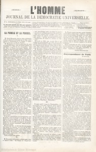 -.-SCIENCE.- -SOL IDA I-tJTi~.- ~ JOURNALDELADEMOCRATIEUNIVERSELLE. N1 21. MERCREDI, 25 AVRIL l S55.-2e Année 1 (Jersey), 19, Dorset Street.-Les manusc·ri1s déposés ne seront I ANOLETRRRE ET CoLONTES: ' pas rendus. - ÜN s'AllONNE: A Jersey, 19, Dor~ct strcc:. -- A Un· an, S shillings on 10 francs. LondrPS, chc:r. .M. STANISLAS,10, Greek-street, Soho Sqnare.-A Six mois. 4 sh. ou 5 fr. Ce Jou1•11al 1uu•ait une fois 1•a1.• 8e11aah11e. Gen~ve (Suisse), chez ::.\LCorsat, libraire, rue Guillaume-Tell. -1 Trois 111ois,2 sh. ou 2 fr. o0 c. PouR L'f:ntANGr.~: Un an, 12 fr. 50. Six mois, 6 fr. 2.:;. Trois mois, 3 fr. 50 c. Toutes lettres et correspondances doivent être affranchies et Belgique, chez tous les libraires. - /L :Madrid, chPz Ca,imir CHAQUENUMi'.:no: '..Irons 1~11 :a.!,011nu~n1cn• 11e 1,~ient d',n·anre. adressées an bureau de I' fmprimerie Universelle à St-Hélier :Monnier, libraire. 3 pence ou 6 sous. LAPAROLETLAPtf~SÉEa I. M. Louis-Bonaparte, clans sa visite à Guidhall, a <lit, en réponse au lord-maire de la Cité, qu'interprète et représentant de 1a France, il remerciait, en son nom, la ville de Londres. M. Bonaparte a le droit de parler pour lui, pour ses magistrats félons, pour ses préfets salariés, ses gendarmes, sa police et ses cent-g·ardes ; mais .{}Hi donc, en France, lui a donné mandat, pour engager le norfl de la patrie dans lf's cordialités intéressées et les diplomaties britanniques? A-t-il consulté l'éternel souverain, le peuple, sur l'alliance, snr la guerre, sur les traités et les folles expéditjons que paient son or et son sang? A-t-il permis à ses assemblées eunuques, à ses conseil$, ombres prosternées, d'appeler la cause à leur trihune et de la discuter, comme l'ont fait les Communes d'Angleterre-~ La Presse, cet enseignement quDtidien, qui a répandu taut de clartés dans le monde, depuis cinqua11te a11s, la PressE:>, qui l'St parfois la torche mais toujours la lumière, a-t-elle rm s'enquérir et débattre'! N ou. Le go1wer11ement seul a conçu les expéditions, formé les allianees, engc1gé les forces, org·,rnisé les conférences, et)" par le Jltoniteur, maintenant il vient, à "oix. basse, expliquer les désastres! La ·France a payé de ses trésors, payé de ses eufonts, parce qu'elle e~t en servi1ude et qu'on peut fouiller son flanc ù pleines mains; mais sa pensée n'a jamais ét~ complice, et ce n'est pas qua11d l'Angleterre gioritie son meurtrier, son geôlier, son bourrean, qu'elle livrera son âme à l'Angleterre. La Cité de Londres :;'est pavoisée comme nnc cathédrale pour offrir l'encens de ses harangues et de ses· ca~solettes à rhomme aux mains tachées de sang, à la conscieuce 1rouée; la Cité de Londres ne comprend rien à la Frunce : elle n'en sait ni les instincts, ni le génie, ni les énergiques et secrets ressentiments. . Que le lord-maire et messieurs les aldermen se rendent à Paris, qu'ils étudient, dans les fêtes les • plus fastueuses. qne donne le crime heureux, le grand silence des masses, et ils verront ce qu'il faut penser de l'incarnation française qu'ils ont saluée si bas -dans leur salle aux cent lustres. Oni, c'est une consolation pour nous, et c'est llne espérance : le peuple de Paris a dt'S curiosités qui l'entraînent : il aime le bruit, le g-rand air, les salves, les fêtes; il va partout où l'appellent la lumière et le mouvemf'nt, mais il ne se donne pas, il ne s'est jamais donné, depuis la nuit du guetapens, et les 1uajestés, filles de cette nuit, ne l'ont point vu comparse aux fètes de leur orgueil. L'Angleterre, elle, s'est donnée en spectqcle, aux pieùs de cet homme. Abdiquant toutes ses fiertés historiques et le sentiment divin des âi{ies libres, elle a glorifié dans cet empereur la trahison et la tyrannie. C'est une contradiction à sa vie antérieure, à sa loi morale; c'e-st un outrage à ses g·loires les plus hautes et les mieux fondées, et si les vieux Ang-lais dn temps de Cromwell ou de Guillaume avaient pu voir cet oubli sacrilég·e de lepr grande histoire, ils auraient redemandé, comme une joie, la nuit de la tombe. On peut tout dire, on doit tout dire aux peuples libres quand ils s'égarent, et si les voix de l'exil, souvent importunes et. rudes, mais loyales et franches, étaient c,mclamnées, comme étrangères, au silence abject des monarchies pures, il ne faudrait plus chercher, en ces pays, ni la dignité, ni la liberté, ni l'honneur. Voilà ponrquoi nous parlons. 'II. M. Bonaparte a dit enrore, au Lord-maire, dans sa réponse écrite : " Ln. France et l'Angletern' " sont naturellement unies sur toutes les granc!es " quP-stions de politique g·énérale et de pro~-;-ès hn- " main qui s'agitent dans le monde." Il a m€·llle laissé tomber de sa lèvre, cent fois pmj11re, ce1te autre parole : "qu'elles ponrsuivaient, <'usemhlc>, " l'amélioratiou de toute~ les contrées de l'E1.1- '' ropé." . - • Il y avait, en 18-18, une contrée libre et qui fondait son gouvernement, son 1..nitô, dans la plus grande ville de l'histoire, à Rome; c'était ritalit• : or, comment est de nouveau tombéf' clans la servitude, dans l'impie servitude de l'étranger, cette patrie des longs combats et d<>sfleurs étf'rnelles? M. Bonaparte a bombardé Rome, tué la République naissante, relevé le g·ran<l prêtre de la 11uit, le pape, et laissé le reste de la cont, ée qu'il muéliore aux fureurs sauvages d'un César-louveteau, celui de Vienne! Il y av~it, en 1849, un penple et une révolution dans cette Hongrie qui e·st le grand cl1emin de l'Orient. Cette révolution avait irs fürncs robustes, et ée peuple s'en allait aux Lataill<:'s, comme s'y rnaient jadis uos légicns de Sambre-etMeusc. Le Czar, ce gTand e1;11cmidu 1our, e:ivnbit alors la contrée, et .M. Ilona parte lJssa foire, et le voilà mujntenant en pleine alliance d'emperenr a, ec le bourreau gui déchire cette même contrc'.e g ue I'l'L.Bouaparte améliore! li y' a de cela près d'un si