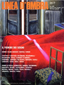 Direzione: Marcello Flores, Goffredo Fofi (Direttore responsabile), Alberto Rollo. Gruppo redazionale: Mario Barenghi, Alfonso Berardinelli, Paolo Bertinetti, Gianfranco Bettin, Francesco Binni, Marisa Bulgheroni, Marisa Caramella, Luca Clerici, Riccardo Duranti, Bruno Falcetto, Pinuccia Ferrari, Fabio Gambaro, Piergiorgio Giacchè, Filippo La Porta, Marcello Lorrai, Danilo Manera, Roberta Mazzanti, Paolo Mereghetti, Santina Mobiglia, Luca Mosso, Maria Nadotti, Marco Nifantani, Oreste Pivetta, Giuseppe Pontremoli, Fabio Rodrfguez Amaya, Lia Sacerdote, Alberto Saibene, Marino Sinibaldi, Paola Splendore. Collaboratori: Damiano D. Abeni, Adelina Aletti, Chiara Allegra, Enrico Alleva, Livia Apa, Guido Armellini, Giancarlo Ascari, Fabrizio Bagatti, Laura Balbo, Alessandro Baricco, Matteo Bellinelli, Stefano Senni, Andrea Berrini, Giorgio Bert, Lanfranco Binni, Luigi Bobbio, Norberto Bobbio, Marilla Boffito, Giacomo Sorella, Franco Brioschi, Giovanna Calabrò, Silvia Calamandrei, Isabella Camera d'Afflitto, Gianni Canova, Rocco Carbone, Caterina Carpinato, Bruno Cartosio, Cesare Cases, Francesco M. Cataluccio, Alberto Cavaglion, Franca Cavagnoli, Roberto Cazzola, Francesco Ciafaloni, Giulia Colace, Pino Corrias, Vincenzo Consolo, Vincenzo Cottinelli, Alberto Cristofori, Peppo Delconte, Roberto Delera, Paola Della Valle, Stefano De Matteis, Carla de Petris, Piera Detassis, Vittorio Dini, Carlo Donolo, Edoardo Esposito, Saverio Esposito, Doriano Fasoli, Giorgio Ferrari, Maria Ferretti, Antonella Fiori, Ernesto Franco, Guido Franzinetti, Giancarlo Gaeta, Alberto Gallas, Roberto Gatti, Filippo Gentiloni, Gabriella Giannachi, Giovanni Giovannetti, Paolo Giovannetti, Giovanni Giudici, Bianca Guidetti Serra, Giovanni Jervis, Roberto Koch, Gad Lerner, Stefano Levi della Torre, Emilia Lodigiani, Mimmo Lombezzi, Maria Maderna, Luigi Manconi, Maria Teresa Mandalari, Bruno Mari, Emanuela Martini, Edoarda Masi, Roberto Menin, Mario Modenesi, Renata Molinari, Diego Mormorio, Antonello Negri, Grazia Neri, Luisa Orelli, Alessandra Orsi, Maria Teresa Orsi, Armando Pajalich, Pia Pera, Silvio Perrella, Cesare Pianciola, Guido Pigni, Giovanni Pillonca, Pietro Polito, Giuliano Pontara, Sandro Portelli, Dario Puccini, Fabrizia Ramondino, Michele Ranchetti, Emanuela Re, Luigi Reitani, Marco Revelli, Alessandra Riccio, Paolo Rosa, Roberto Rossi, Gian Enrico Rusconi, Nanni Salio, Domenico Scarpa, Maria Schiavo, Franco Serra, Francesco Sisci, Piero Spi la, Antonella Tarpino, Fabio Terragni, Alessandro Triulzi, Gianni Turchetta, Federico Varese, Bruno Ventavoli, Emanuele Vinassa de Regny, Tullio Vinay, Itala Vivan, Gianni Volpi. Segreteria di redazione: Serena Daniele Progetto grafico: Andrea Rauch Fotocomposizione: ShaKe - Tel. e Fax 02/58317306. Amministrazione e abbonamenti: Daniela Pignatiello - Tel. 02/66990276 - Fax 02/6698 I25 I. Hanno contribuito alla preparazione di questo numero: Leonardo Dehò, Michele Neri, Maria Profili, Marco Antonio Sannella, Marco Tarchini, Barbara Verduci, le agenzie fotografiche FarabolaFoto, Contrasto, Effigie e Grazia Neri. Editore: Linea d'ombra Edizioni srl - Via Gaffurio 4 20124 Milano Tel. 02/669093 I Fax: 6691299 Distrib. edicole Messaggerie Periodici SpA aderente A.D.N. - Via Famagosta 75 - Milano Tel. 02/8467545-8464950 Distrib. librerie POE - Via Tevere 54 - 50019 Sesto Fiorentino - Tel. 055/301371 Stampa Grafiche Biessezeta Sri - Via A. Grandi 46 - 200 I7 Mazzo di Rho (MI) - Tel. 02/93903882 Fax 02/93901297. LINEA D'OMBRA Iscritta al tribunale di Milano in data 18.5.87 al n. 393. Dir. responsabile: Goffredo Fofi LINEDA'OMBRA anno XIV maggio 1996 numero 115 4 6 8 ILCONTESTO Elisabetta Bartuli Hoda Barakat Assia Djebar SCRlffRICI E SCRlffURA Donne e Islam Il primo salone del libro della donna araba Vedere da lontano a cura di Isabella Camera D'Afflitto Derubate della scrittura a cura di Antonella Viale Il fiorire dei sogni Marisa Bulgheroni: La poetica della convivenza (p. 11), Carson McCullers: Il fiorire del sogno (p.12), Sylvia Plath: Lady Lazarus (p. 15), Ariel, La luna e il cipresso (p. 16), Elsa Morante: Pro o contro la bomba atomica (p. 18), Marianne Moore: La poesia, La mente è una cosa che incanta, Come una fortezza, Eppure (p. 23), Nadine Gordimer: Il gesto essenziale (p. 25), Ida Vitale: Obblighi quotidiani, Rosario Castellanos: Silenzio con riferimento a una pietra antica (p. 30), lngeborg Bachmann: Letteratura come utopia (p. 31), Amelia Rosse/li: Una tua faccia ha sì contorni, Mio angelo io non seppi, Amarti e non poter far altro (p. 37), Cynthia Ozick: Letteratura e politica sessuale (p. 38), Anna Achmatova: In luogo di prefazione, Pietrogrado, 1919, Ultimo brindisi (p. 41), Marina Cvetaeva: Ho apparecchiato la tavola per sei ... (p. 41), Tentativo di gelosia (p. 42), Virginia Woolf: Middlebrow (p. 43), Christa Wolf: Realtà (p. 46), Eve Kosofsky Sedgwick: Una velocità che uccide (p. 48), Nathalie Sarraute: L'uso della parola (p. 48), lngeborg Bachmann: A voi parole (p. 51), Flannery O'Connor: Scrivere racconti (p. 52), Elizabeth Bishop: Manuelzinho (p. 57), Margaret Laurence: Meccanico o organico (p. 59), Antonia Pozzi: La vita sognata (p.63), Christina Stead: L'oceano del racconto (p. 63), Gabriela Mistral: Canzone delle ragazze morte, Assenza, Paradiso (p. 67), Anita Desai: Le tre prigioni dell'India (p. 68), Bianca Tarozzi: Famiglie (p. 71), Antonella Anedda: Chiusa di vento (p. 72), Anna Belardinelli: Tre racconti (p. 72), Martina Banchetti: L'alfabeto del corpo, Pausa pomeridiana alla facoltà di lettere (p. 74), In attesa della prima teatrale "Deserti", La donna albero, La grammatica del tuo amore, In Publium Ovidium Nasonem, La donna conchiglia e l'uomo serpente (p. 75) CONFRONTI 76 INBREVE Letture, recensioni, segnalazioni La copertina di questo numero è di Gabriella Giandelli Abbonamento annuale: ITALIA L. 100.000, ESTERO L. 120.000 a mezzo assegno bancario o c/c postale n. 54140207 intestato a Linea d'ombra o tramite carta di credito SI (si veda i